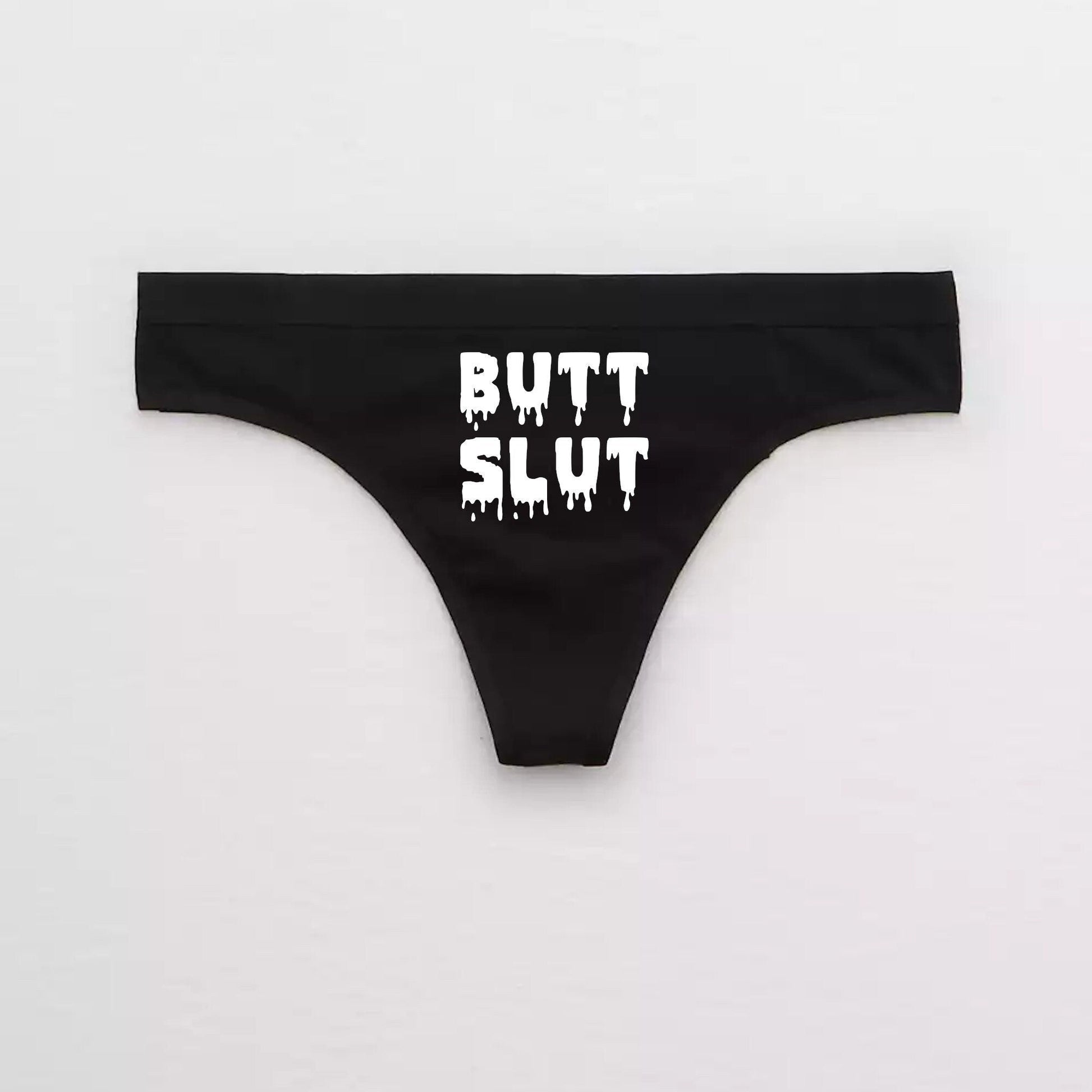 This "Butt Slut" thong perfect for slutty anal queens who love anal play! Show off your slutty side with these thong panties that feature a very naughty liquid drip font.