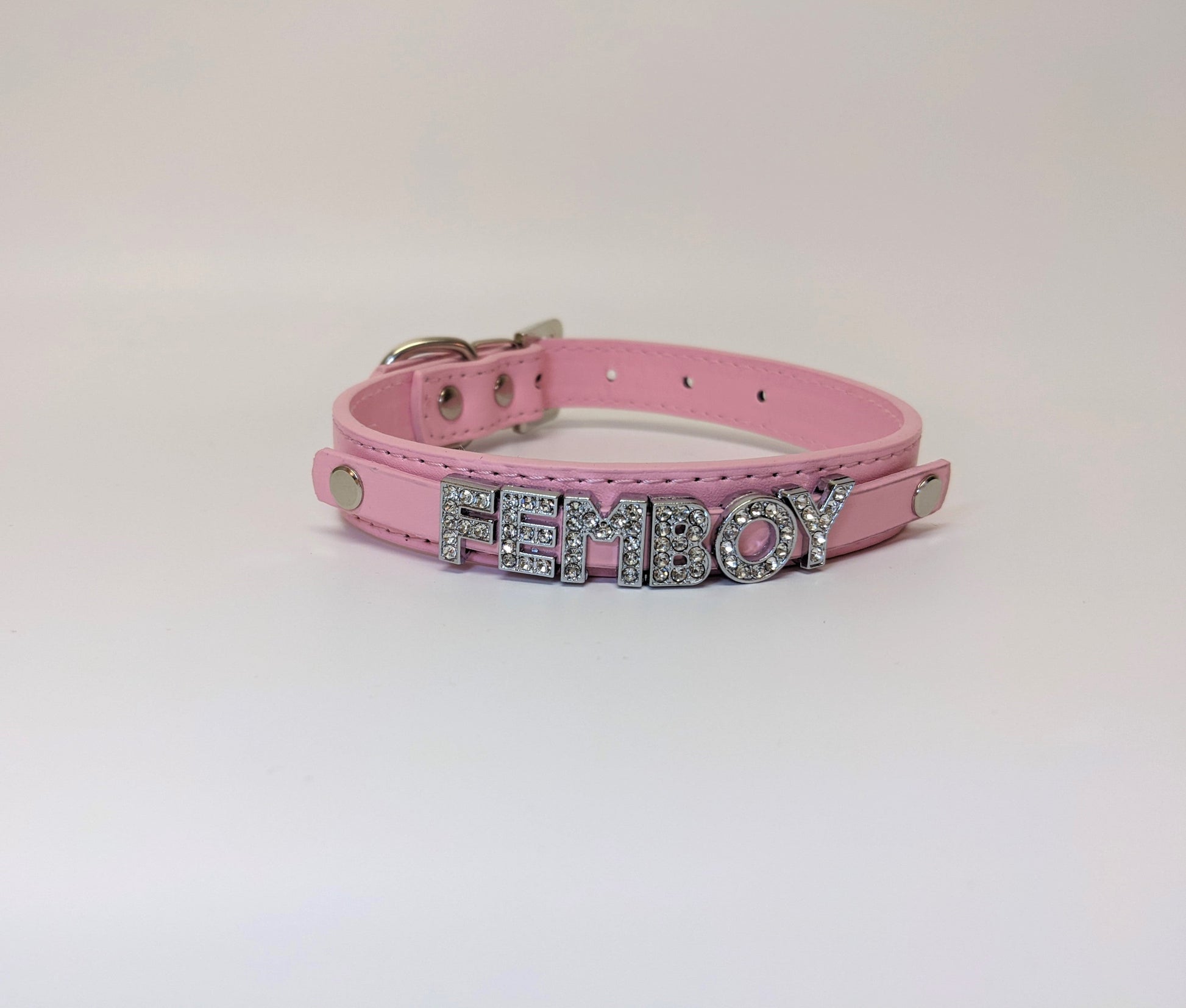 This naughty but nice "Femboy" collar is perfect for submissive femboys who love to show off! This beautiful vegan leather choker collar features stunning jewel letters that spell out "Femboy". Choose from 3 different collar colors.