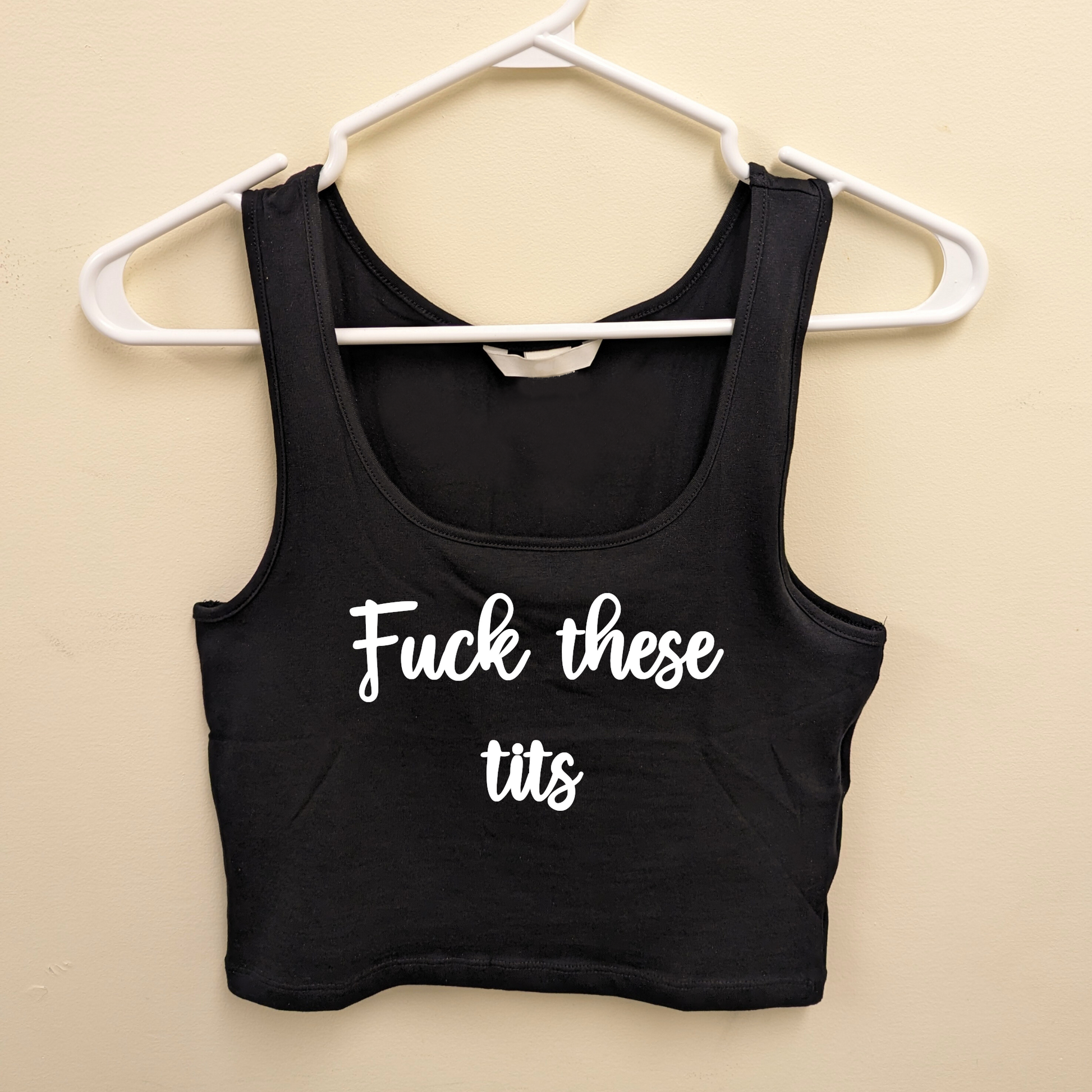 This kinky cropped tank top tells your partner exactly what you want! It says "Fuck These Tits" in an adorable cursive style design and your choice of text color. Perfect for naughty sluts who love cum. Available in plus sizes.