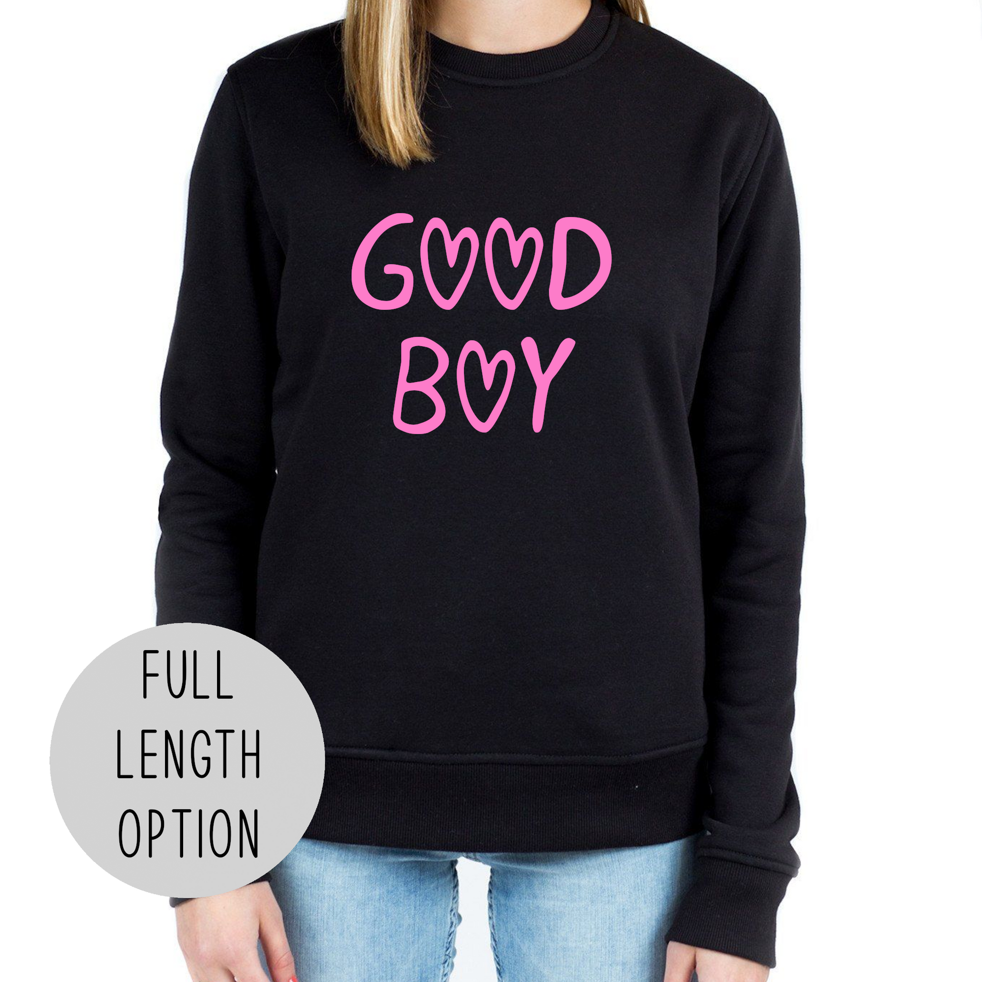 This adorable sweater shows off what a good little boy you are! It says "Good Boy" in an adorable hearts-style design. The design is available in 9 colors. You can choose from a sexy cut off cropped sweater or a regular full length comfy sweater! Item is pictured in design color "Bubblegum Pink".