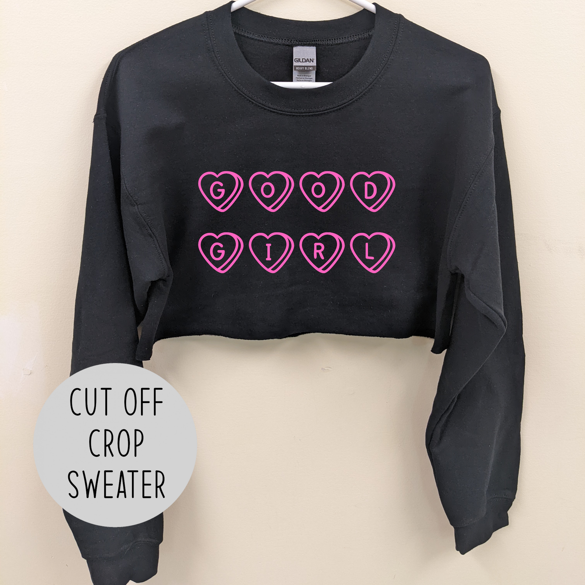 This adorable sweater is perfect for all the good little girls. This super comfy and cute sweater says "Good GIrl" in a candy hearts style design. The design is available in 9 colors. Features a cut off crop style bottom.