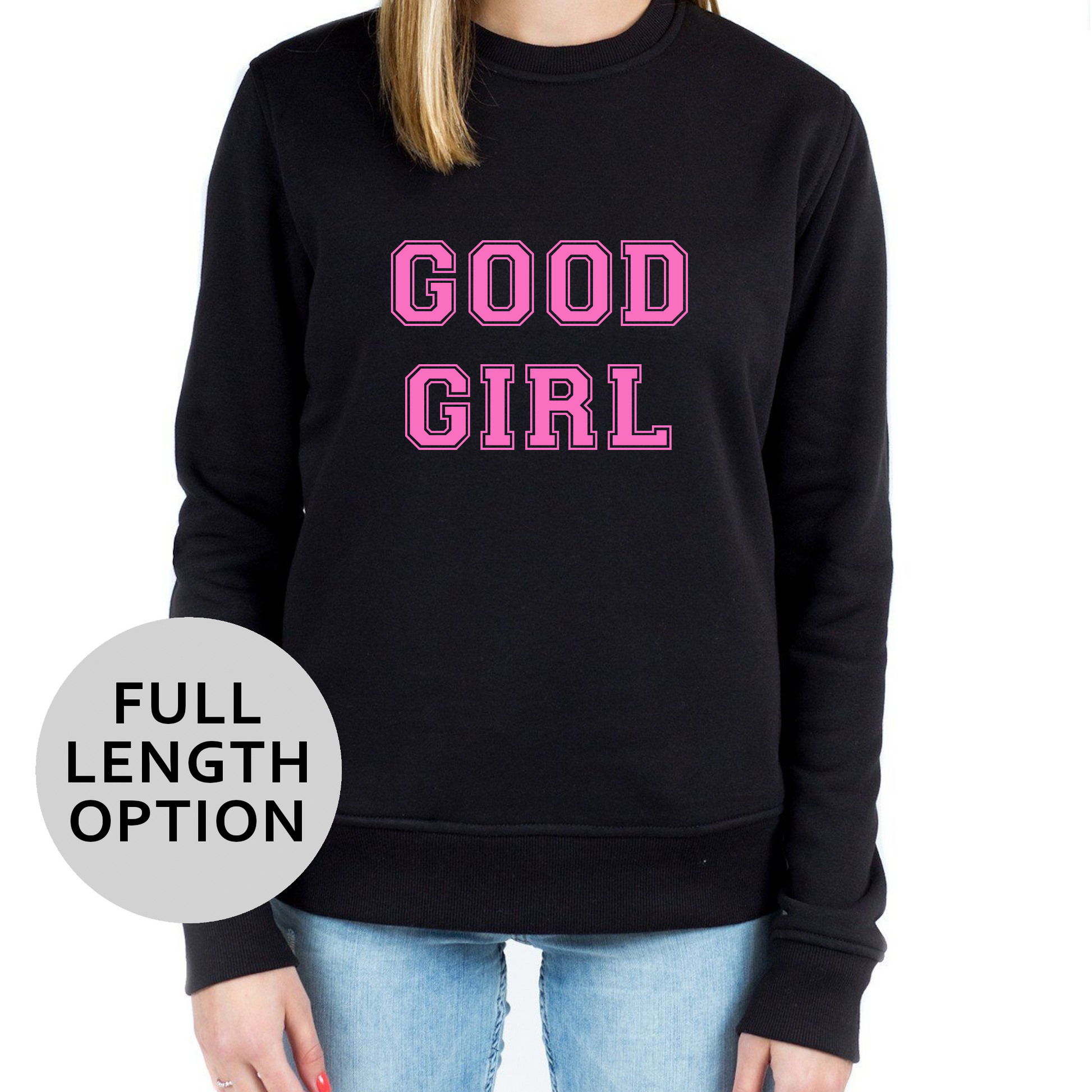 This adorable sweater is perfect for all the good little girls! It says "Good Girl" in an adorable varsity-style design. The design is available in 9 colors. You can choose from a sexy cut off cropped sweater or a regular full length comfy sweater!