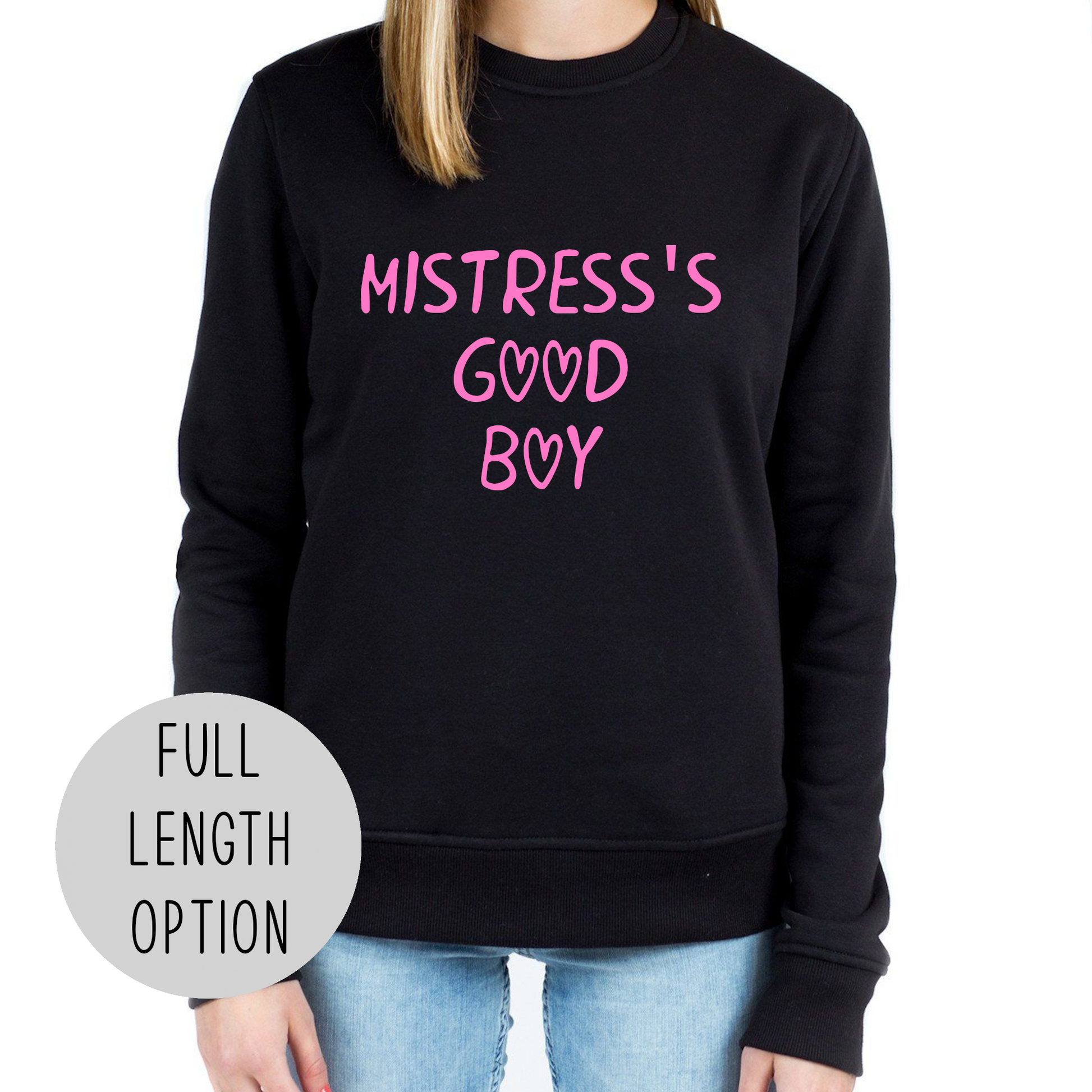 This adorable sweater shows off what a good little boy you are! It says "Mistress's Good Boy" in your choice of design color. Your Mistress or Mommy Domme will love this kinky sweater. The design is available in 9 colors. You can choose from a sexy cut off cropped sweater or a regular full length comfy sweater! Item is pictured in design color "Bubblegum Pink".