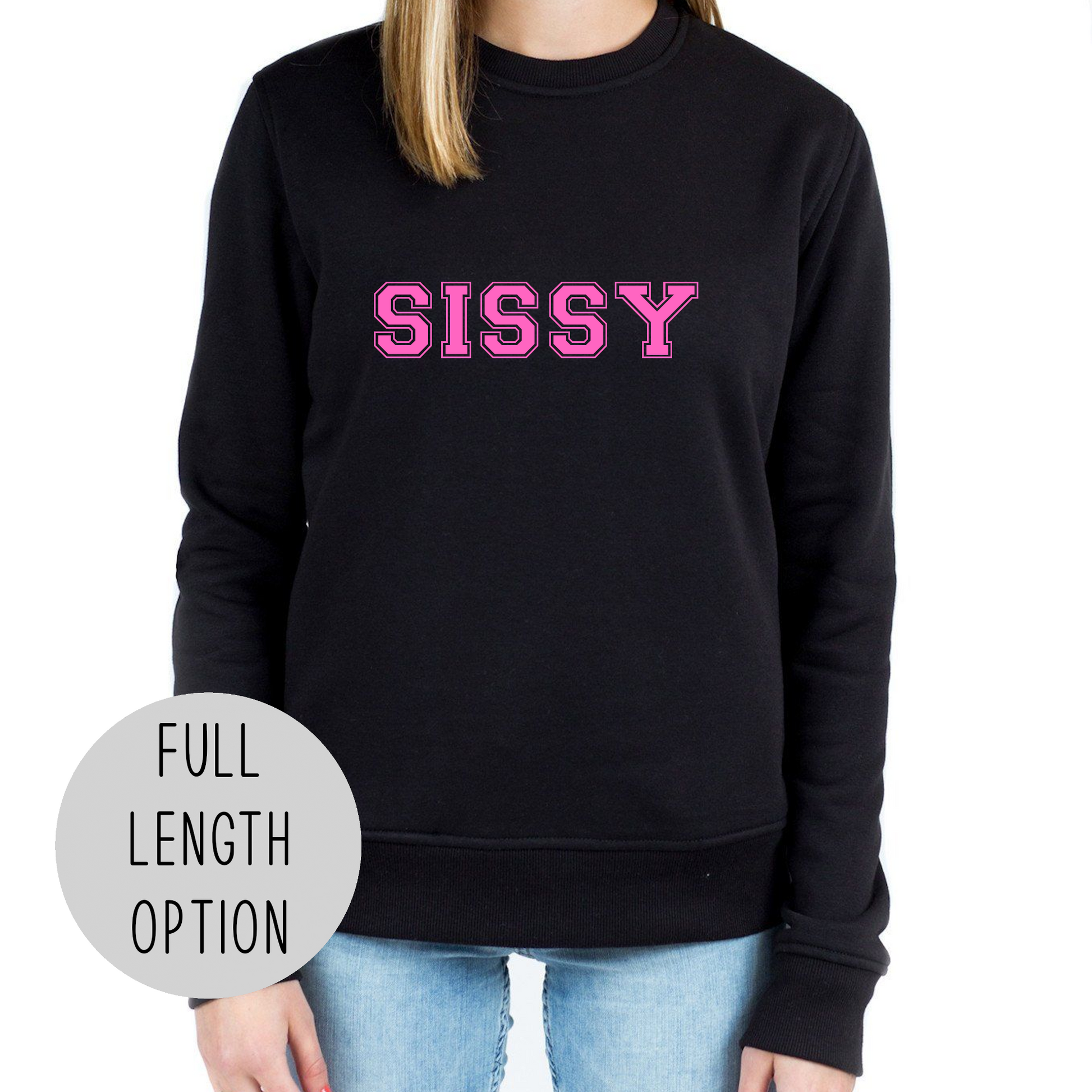 This adorable sweater is perfect for all the subby femboys! It says "Sissy" in an adorable varsity-style design. The design is available in 9 colors. You can choose from a sexy cut off cropped sweater or a regular full length comfy sweater!